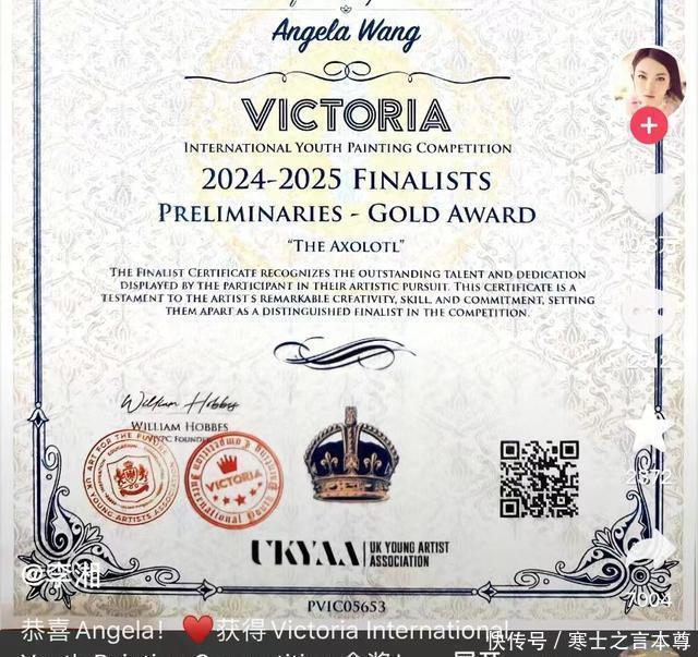 最近她获得了一个国外的比赛金奖,据网上爆料这个比赛很正规,每次选取几千份作品,最后却只有几百份作品才可以进入比赛,然后在这几百份里选出第一名, 而小王的作品就拔得了头筹获得金奖,父母都在第一时间发布了祝福她的动态。