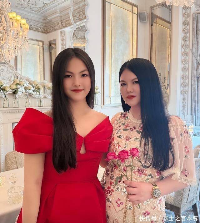 这是一张和妈妈李湘的合照,李女士的手里还拿着粉红色的玫瑰花,穿着一件上面镶满不同颜色宝石的礼服, 看身后的装饰是法式风格的,很适合小王这个年纪,仔细端详发现两个人长得真是太像了。